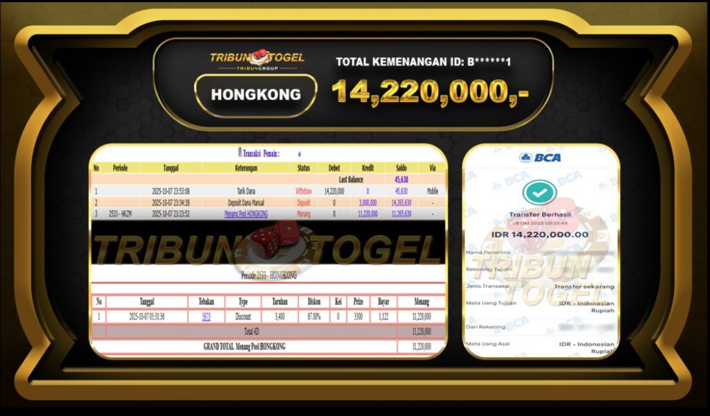 Kami ucapkan selamat kepada user ID : B******1 telah berhasil withdraw sebesar Rp. 14,220,000,- di game : HONGKONG LOTTO Bukti pembayaran jackpot member Tribuntogel kami bayar lunas dengan waktu paling singkat.