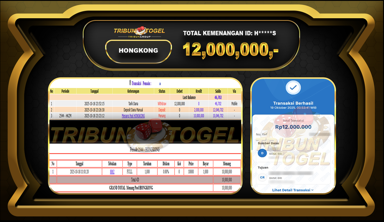 Kami ucapkan selamat kepada user ID : H*****s telah berhasil withdraw sebesar Rp. 12,000,000,- di game : HONGKONG LOTTO Bukti pembayaran jackpot member Tribuntogel kami bayar lunas dengan waktu paling singkat.