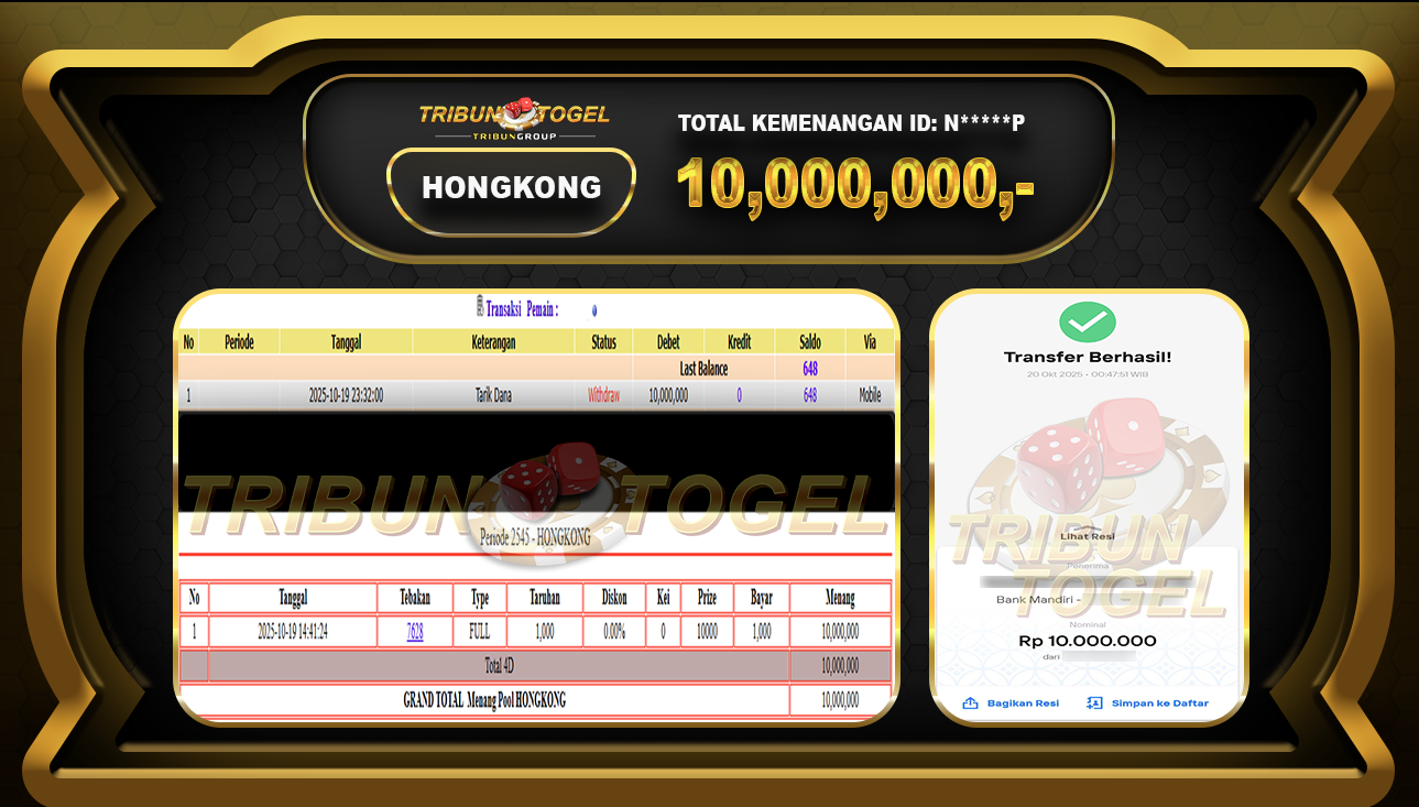 Kami ucapkan selamat kepada user ID : N******p telah berhasil withdraw sebesar Rp. 10,000,000,- di game : HONGKONG LOTTO Bukti pembayaran jackpot member Tribuntogel kami bayar lunas dengan waktu paling singkat.