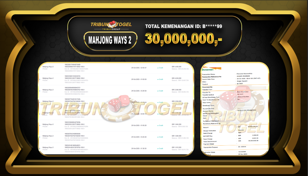 Kami ucapkan selamat kepada user ID : B*****99 telah berhasil withdraw sebesar Rp.30,000,000,- di game : MAHJONG WINS 2 Bukti pembayaran jackpot member Tribuntogel kami bayar lunas dengan waktu paling singkat.
