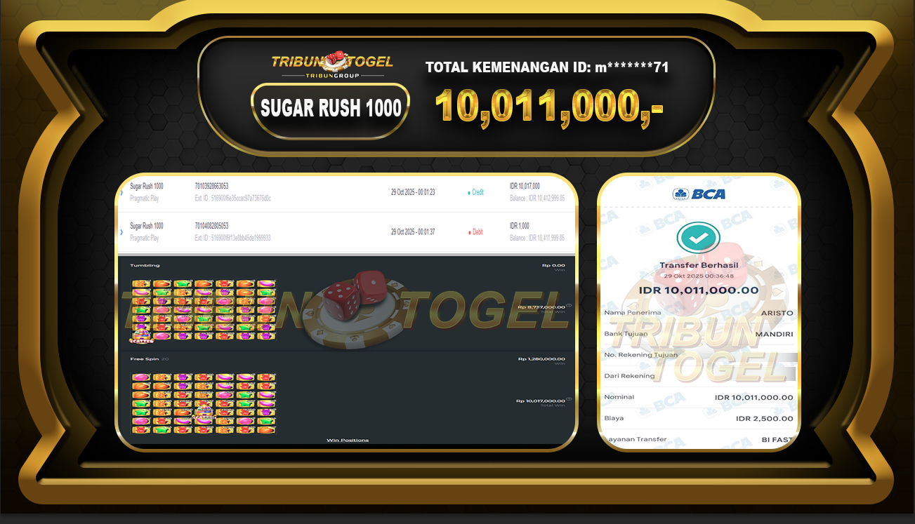 Kami ucapkan selamat kepada user ID : j****04 telah berhasil withdraw sebesar Rp.10.011.000,- di game : SLOT SUGAR RUSH 1000 Bukti pembayaran jackpot member Tribuntogel kami bayar lunas dengan waktu paling singkat.