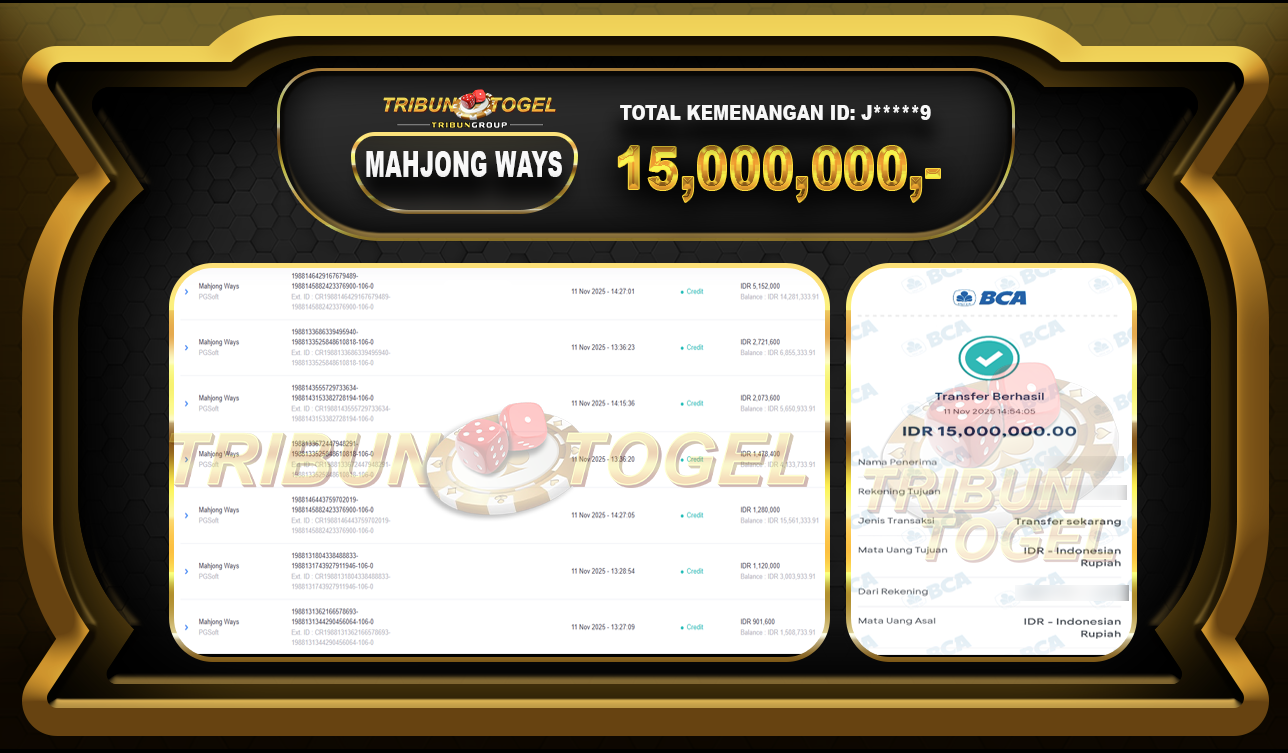 Kami ucapkan selamat kepada user ID : J*****9 telah berhasil withdraw sebesar Rp. 15,000,000,- di game : SLOT MAHJONG WAYS Bukti pembayaran jackpot member Tribuntogel kami bayar lunas dengan waktu paling singkat.