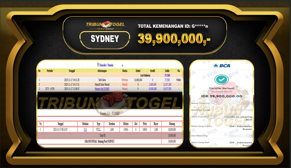 Kami ucapkan selamat kepada user ID : G*****n telah berhasil withdraw sebesar Rp.39,900,000,- di game : SYDNEYLOTTO Bukti pembayaran jackpot member Tribuntogel kami bayar lunas dengan waktu paling singkat.