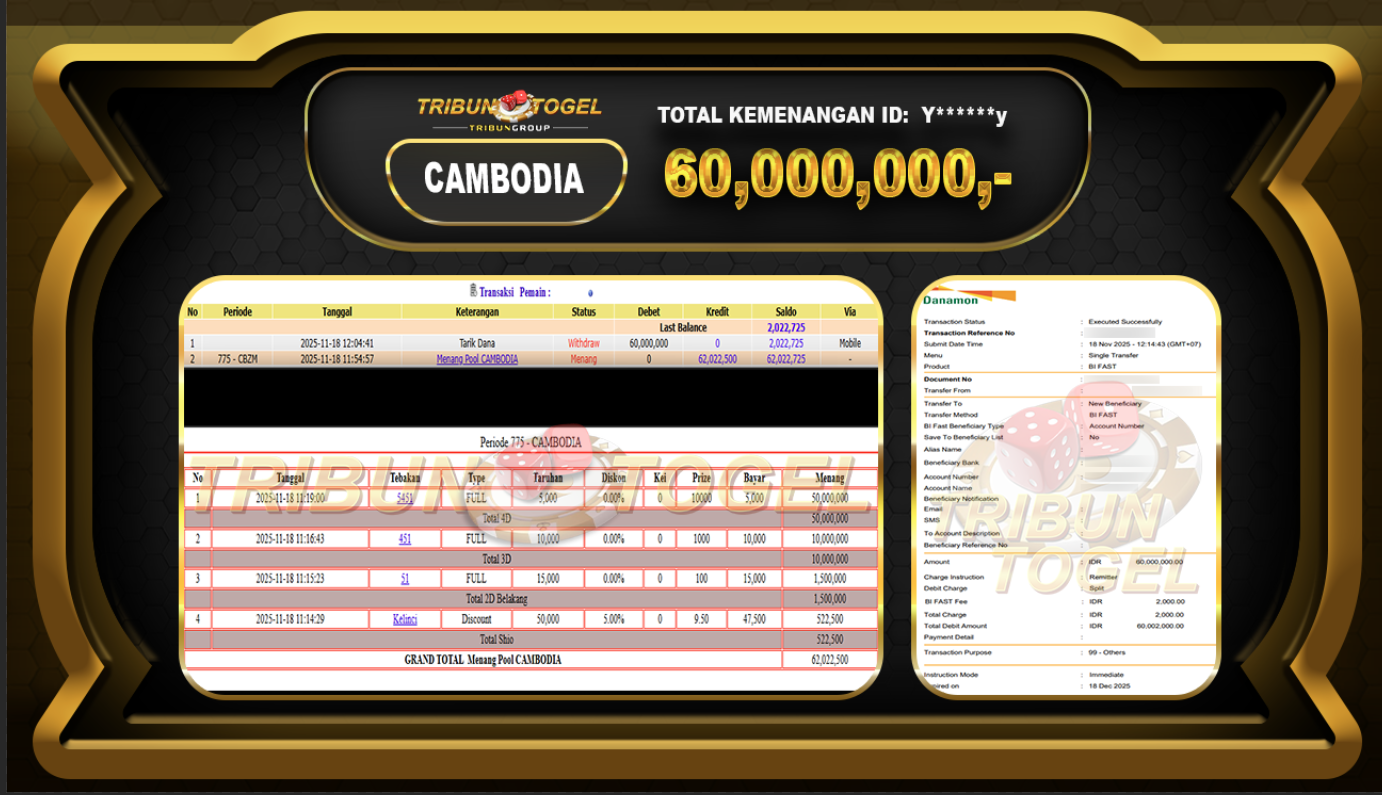 Kami ucapkan selamat kepada user ID : Y******y telah berhasil withdraw sebesar Rp.60,000,000,- di game : CAMBODIA Bukti pembayaran jackpot member Tribuntogel kami bayar lunas dengan waktu paling singkat.
