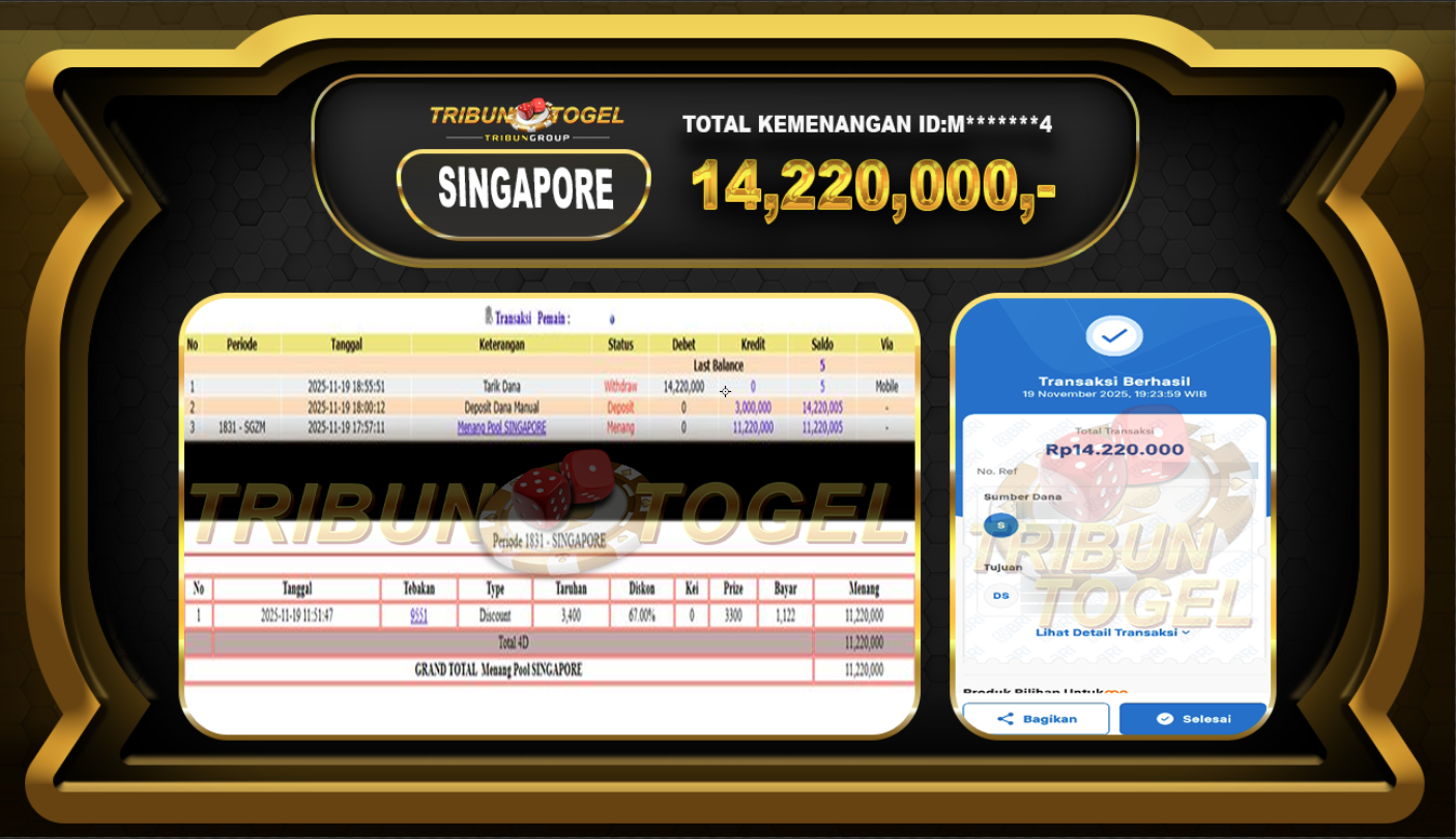 Kami ucapkan selamat kepada user ID :M******4 telah berhasil withdraw sebesar Rp. 14,220,000,- di game : SINGAPORE Bukti pembayaran jackpot member Tribuntogel kami bayar lunas dengan waktu paling singkat.