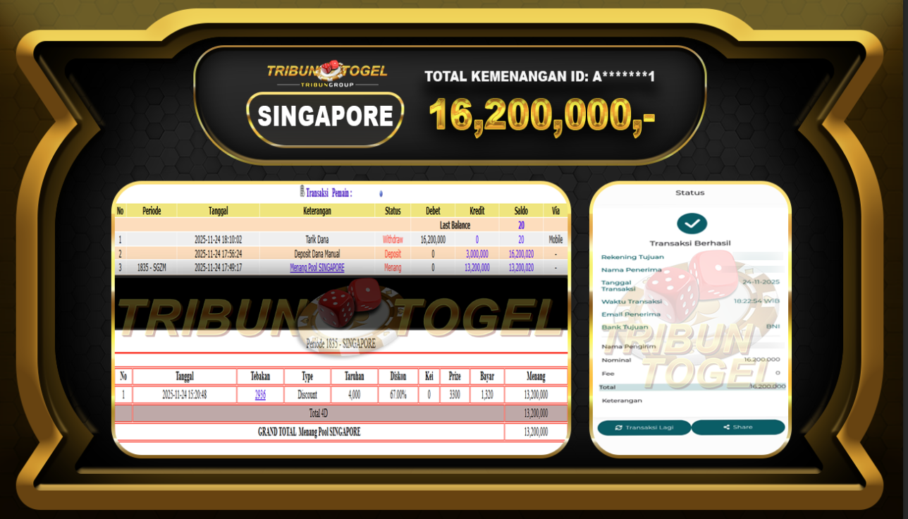 Kami ucapkan selamat kepada user ID :A********1 telah berhasil withdraw sebesar Rp. 16,200,000,- di game : SINGAPORE Bukti pembayaran jackpot member Tribuntogel kami bayar lunas dengan waktu paling singkat.