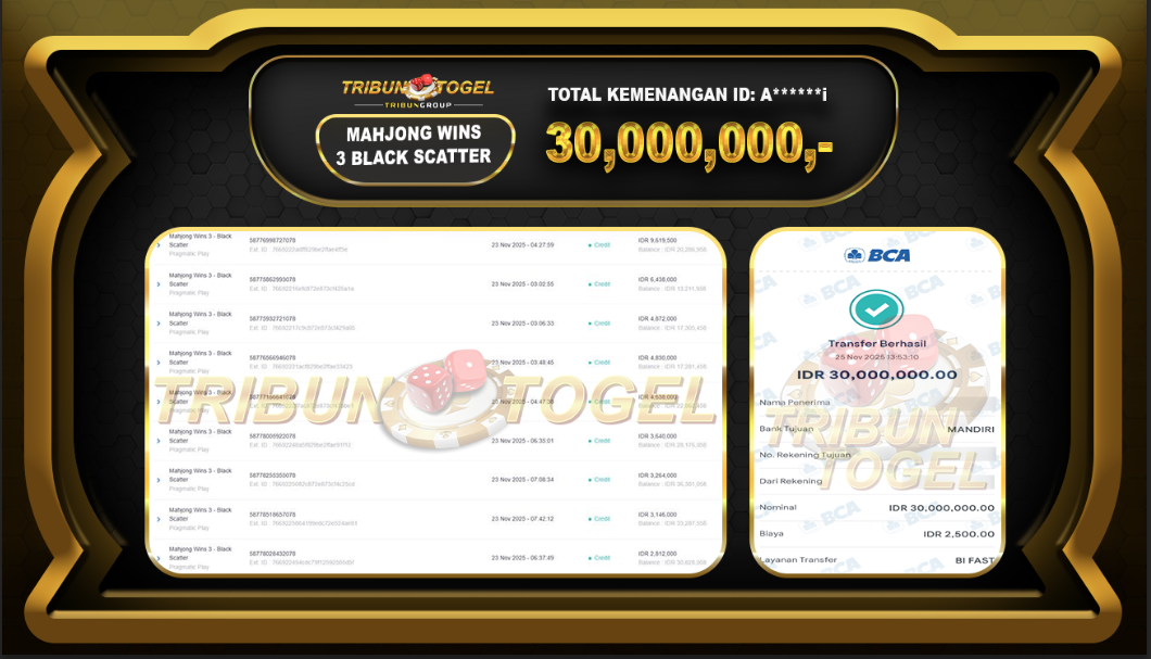Kami ucapkan selamat kepada user ID : A*******i telah berhasil withdraw sebesar Rp.30,000,000,- di game : MAHJONG WINS 3 BLACK SCATTER Bukti pembayaran jackpot member Tribuntogel kami bayar lunas dengan waktu paling singkat.