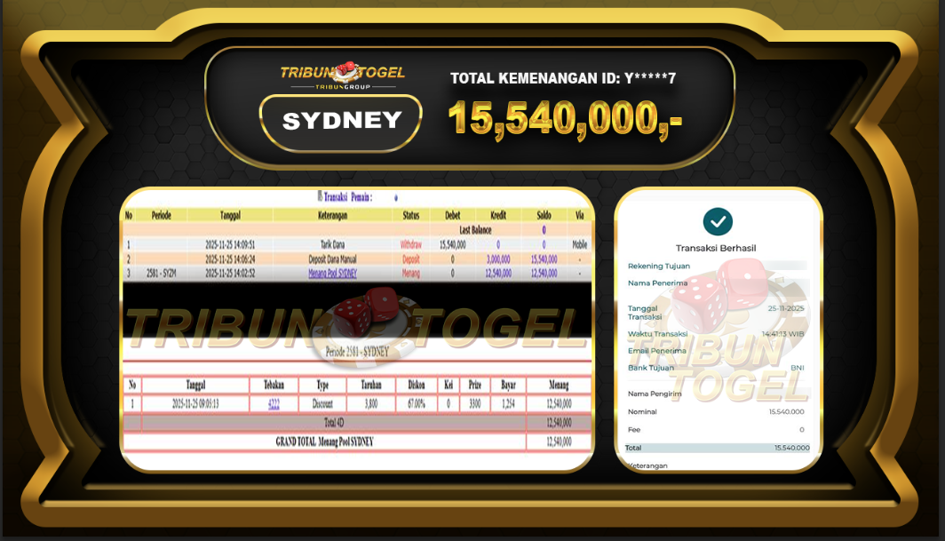 Kami ucapkan selamat kepada user ID : Y******7 telah berhasil withdraw sebesar Rp.15,540,000,- di game : SYDNEYLOTTO Bukti pembayaran jackpot member Tribuntogel kami bayar lunas dengan waktu paling singkat.