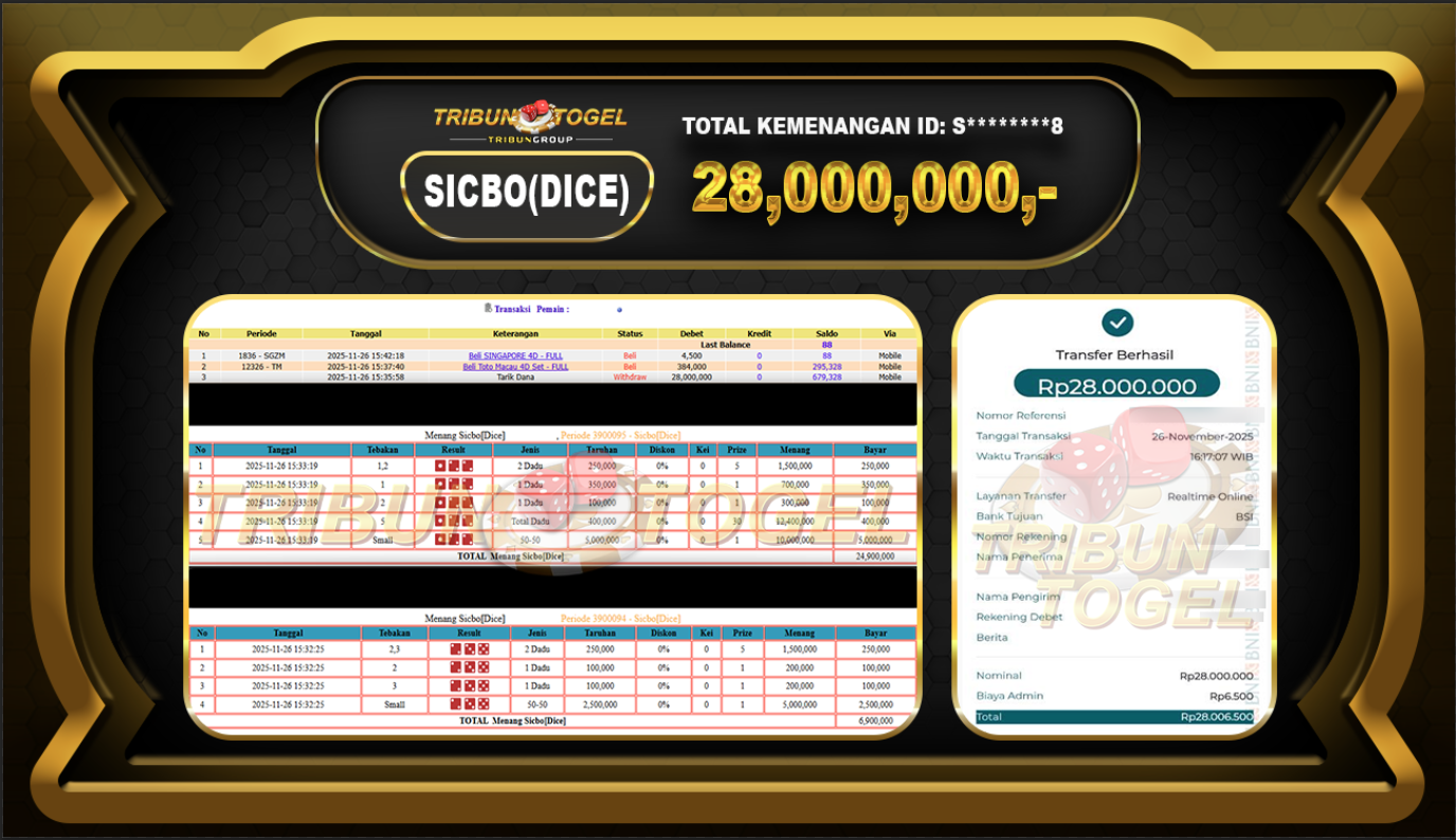 Kami ucapkan selamat kepada user ID : S*******8 telah berhasil withdraw sebesar Rp. 28,000,000,- di game : SICBO (DICE) Bukti pembayaran jackpot member Tribuntogel kami bayar lunas dengan waktu paling singkat.