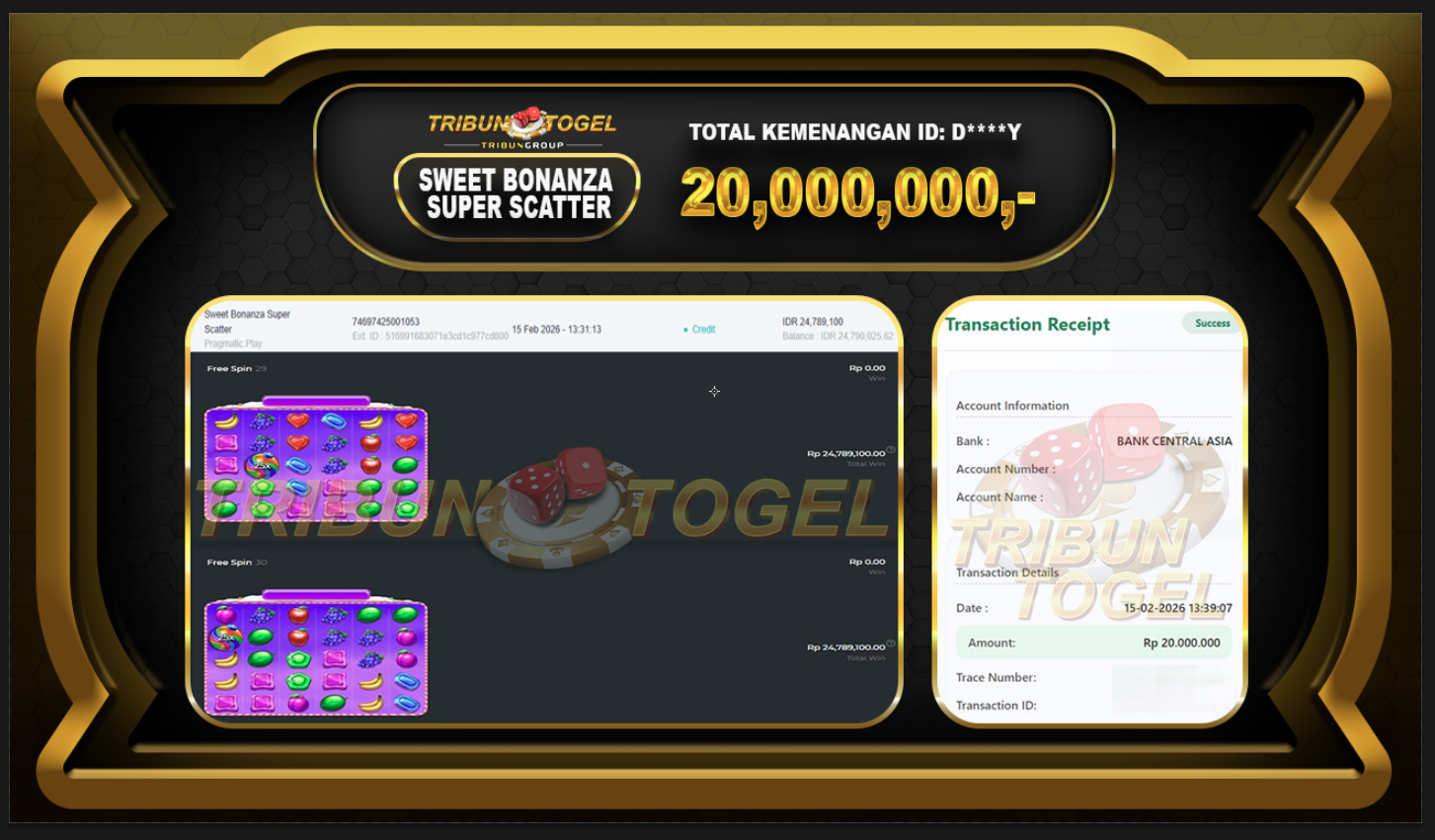 Kami ucapkan selamat kepada user ID : D*****l  telah berhasil withdraw sebesar Rp.20,000,000: SWEET BONANZA SUPER SCATTER Bukti pembayaran jackpot member Tribuntogel kami bayar lunas dengan waktu paling singkat.