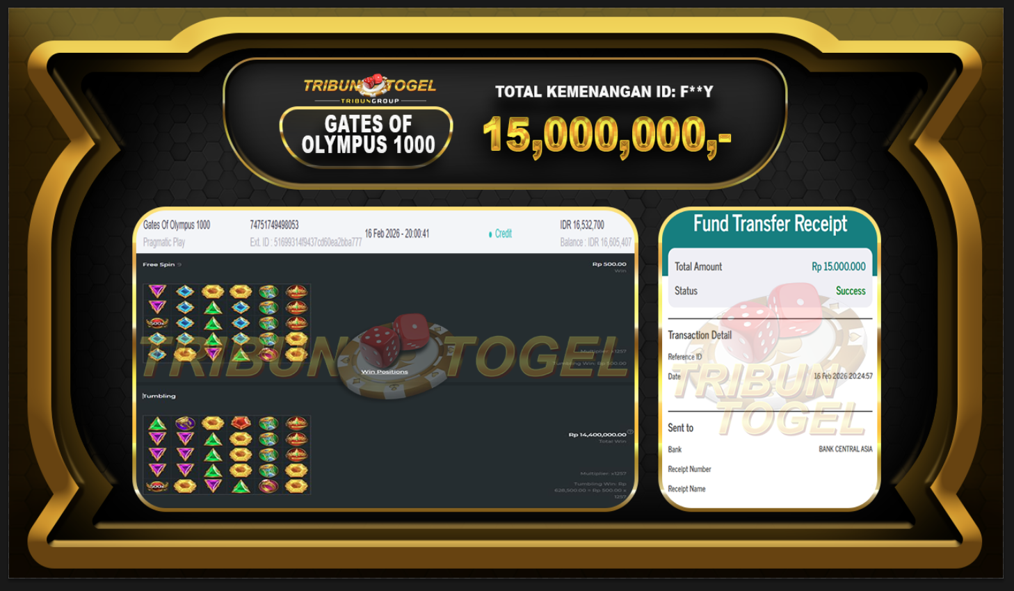 Kami ucapkan selamat kepada user ID : F**Y telah berhasil withdraw sebesar Rp. 15,000,000,- di game : GATES OF OLYMPUS SUPER SCATTER Bukti pembayaran jackpot member Tribuntogel kami bayar lunas dengan waktu paling singkat.