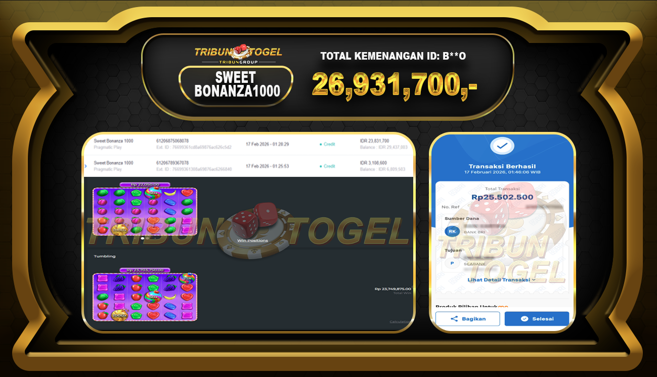 Kami ucapkan selamat kepada user ID :B**O telah berhasil withdraw sebesar Rp.26,931,700 di game : SLOT SWEET BONANZA 1000 Bukti pembayaran jackpot member Tribuntogel kami bayar lunas dengan waktu paling singkat.