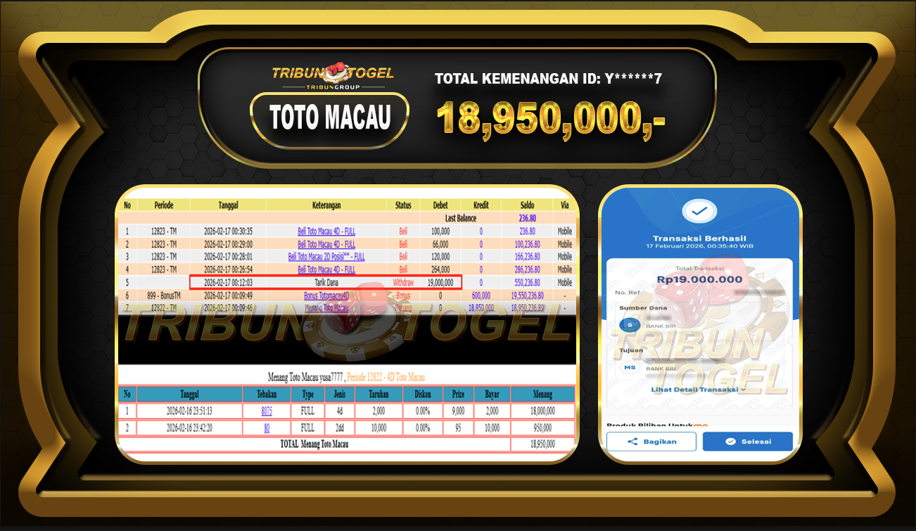 Kami ucapkan selamat kepada user ID : Y******7 telah berhasil withdraw sebesar Rp. 18,950,000,- di game : TOTOMACAU Bukti pembayaran jackpot member Tribuntogel kami bayar lunas dengan waktu paling singkat