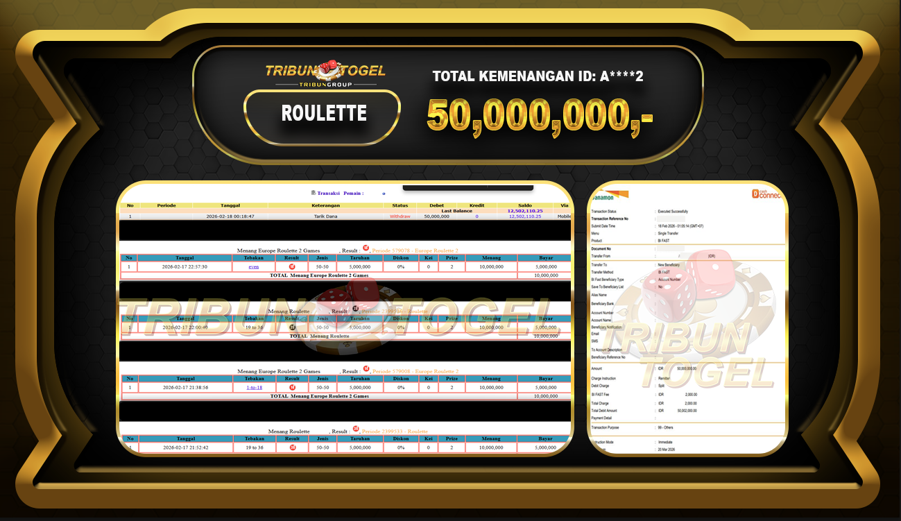 Kami ucapkan selamat kepada user ID : A*****2 telah berhasil withdraw sebesar Rp. 50,000,000,- di game : ROULETTE Bukti pembayaran jackpot member Tribuntogel kami bayar lunas dengan waktu paling singkat.