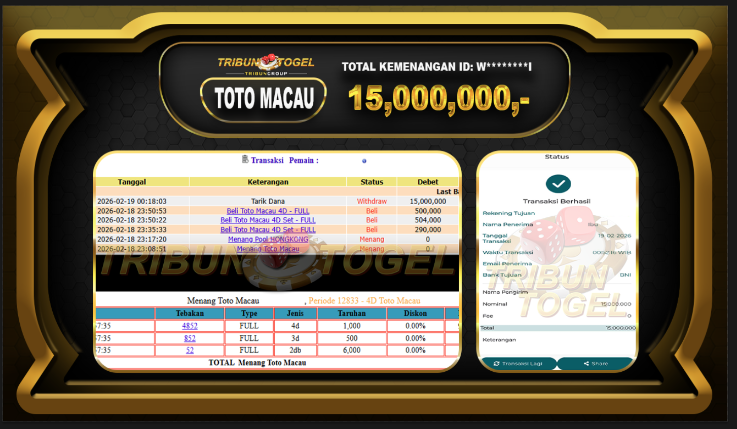 Kami ucapkan selamat kepada user ID : W********i telah berhasil withdraw sebesar Rp. 15,000,000,- di game : TOTOMACAU Bukti pembayaran jackpot member Tribuntogel kami bayar lunas dengan waktu paling singkat
