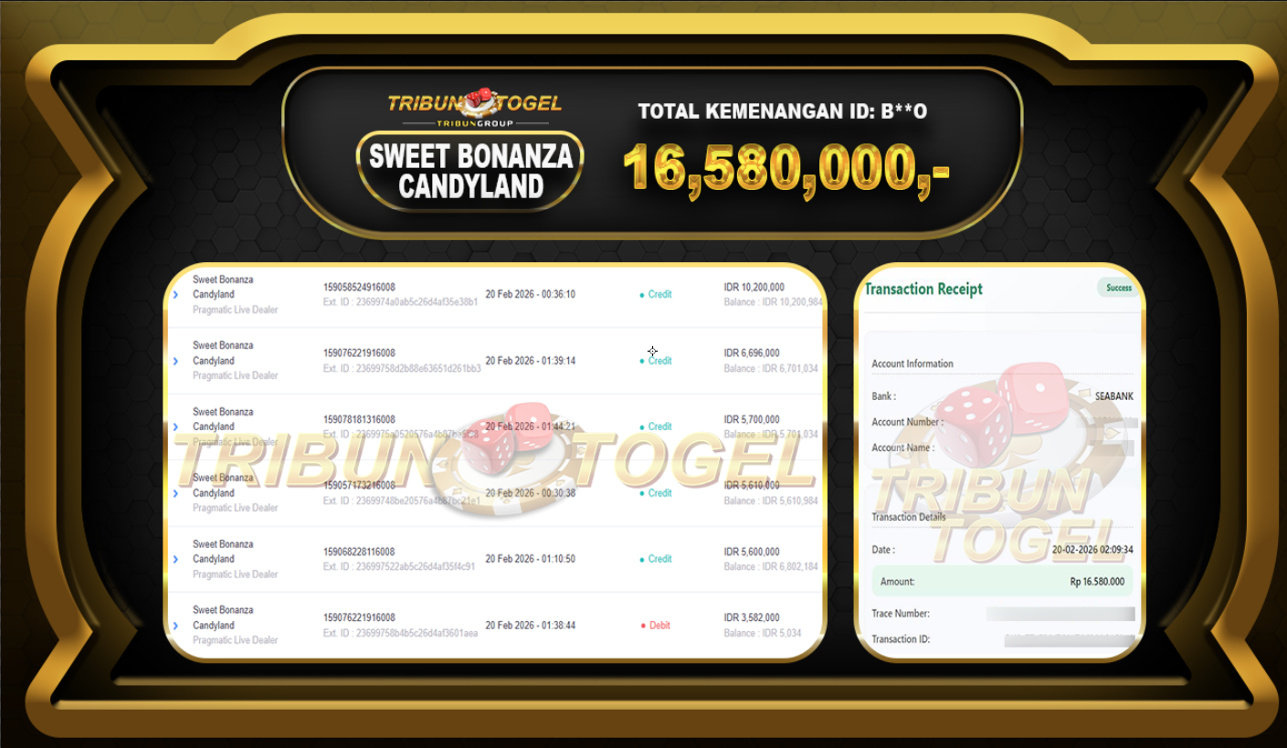 Kami ucapkan selamat kepada user ID : B**o  telah berhasil withdraw sebesar Rp.16,580,000: SLOT SWEET BONANZA CANDYLAND  Bukti pembayaran jackpot member Tribuntogel kami bayar lunas dengan waktu paling singkat.