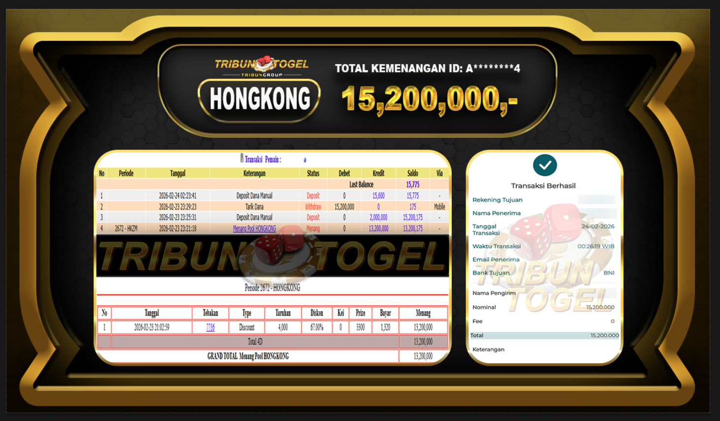 Kami ucapkan selamat kepada user ID : A*******4 telah berhasil withdraw sebesar Rp. 15,200,000,- di game : HONGKONG LOTTO Bukti pembayaran jackpot member Tribuntogel kami bayar lunas dengan waktu paling singkat.