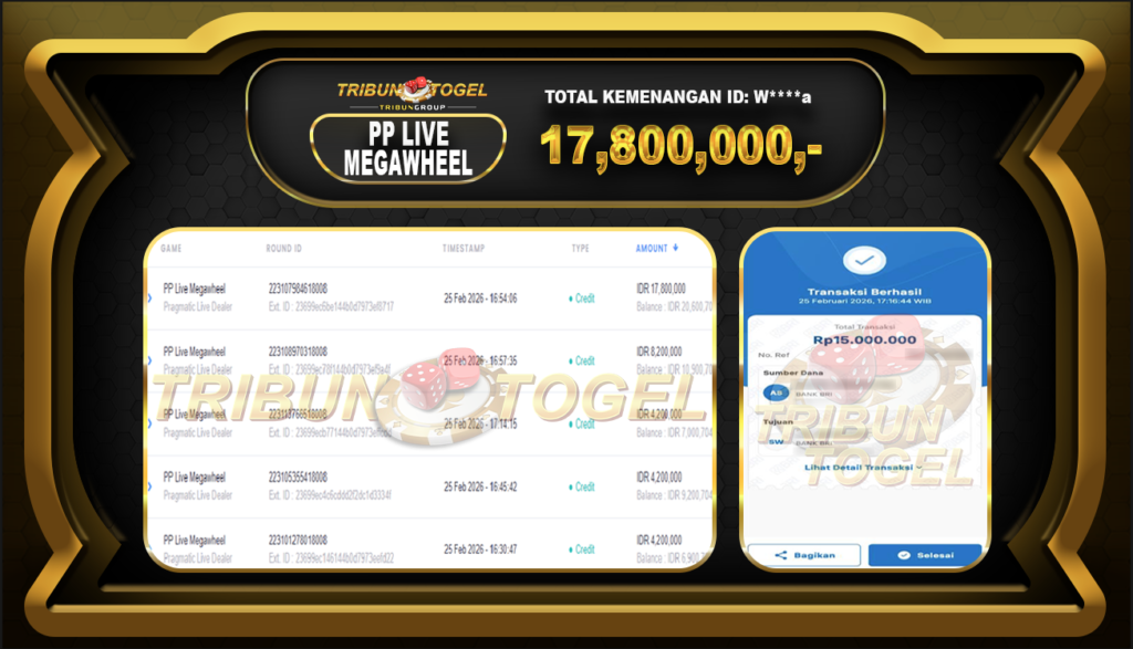 Kami ucapkan selamat kepada user ID : W****A telah berhasil withdraw sebesar Rp17.800.000,- di game : PP LIVE GAME WHELL Bukti pembayaran jackpot member Tribuntogel kami bayar lunas dengan waktu paling singkat.