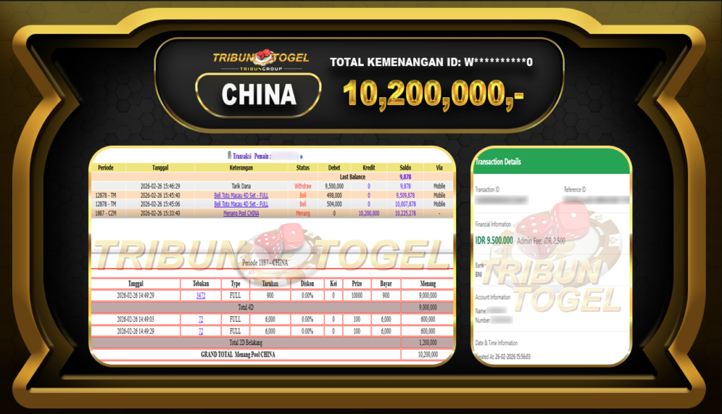Kami ucapkan selamat kepada user ID :W*********0 telah berhasil withdraw sebesar Rp.10,200,000,- di game : CHINA Bukti pembayaran jackpot member Tribuntogel kami bayar lunas dengan waktu paling singkat.
