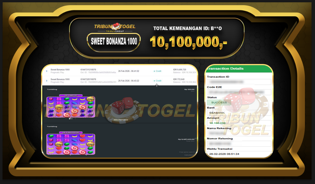 Kami ucapkan selamat kepada user ID :B***o telah berhasil withdraw sebesar Rp.10,100,000 game : SLOT SWEET BONANZA 1000 Bukti pembayaran jackpot member Tribuntogel kami bayar lunas dengan waktu paling singkat.