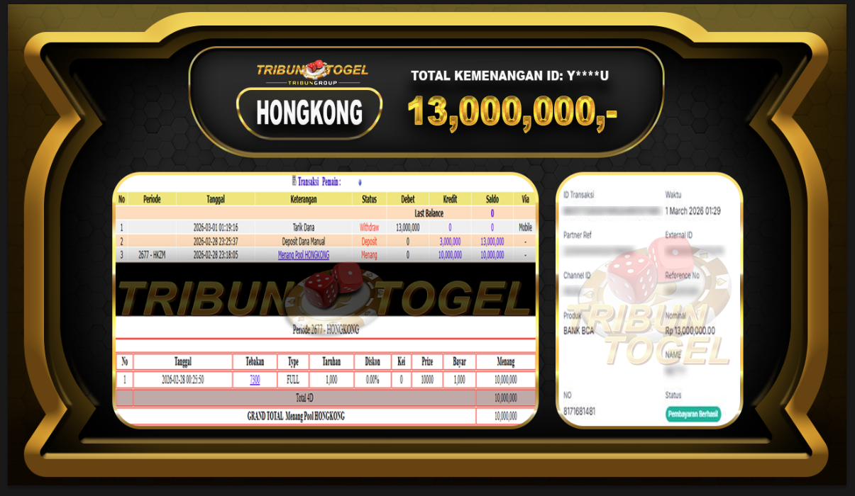 Kami ucapkan selamat kepada user ID : Y****U telah berhasil withdraw sebesar Rp. 13,000,000,- di game : HONGKONG LOTTO Bukti pembayaran jackpot member Tribuntogel kami bayar lunas dengan waktu paling singkat.