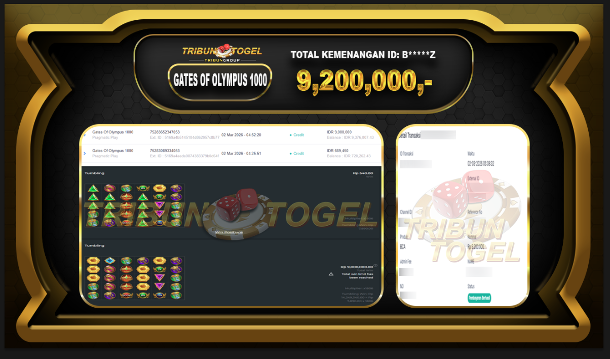 Kami ucapkan selamat kepada user ID : B*****Z telah berhasil withdraw sebesar Rp. 9,200,000,- di game : GATES OF OLYMPUS SUPER SCATTER Bukti pembayaran jackpot member Tribuntogel kami bayar lunas dengan waktu paling singkat.