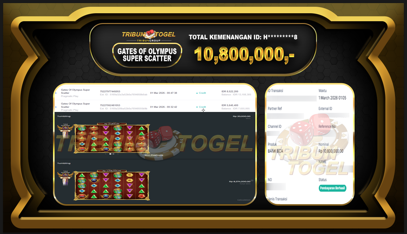 Kami ucapkan selamat kepada user ID : H********8 telah berhasil withdraw sebesar Rp. 10,800,000,- di game : GATES OF OLYMPUS SUPER SCATTER Bukti pembayaran jackpot member Tribuntogel kami bayar lunas dengan waktu paling singkat.
