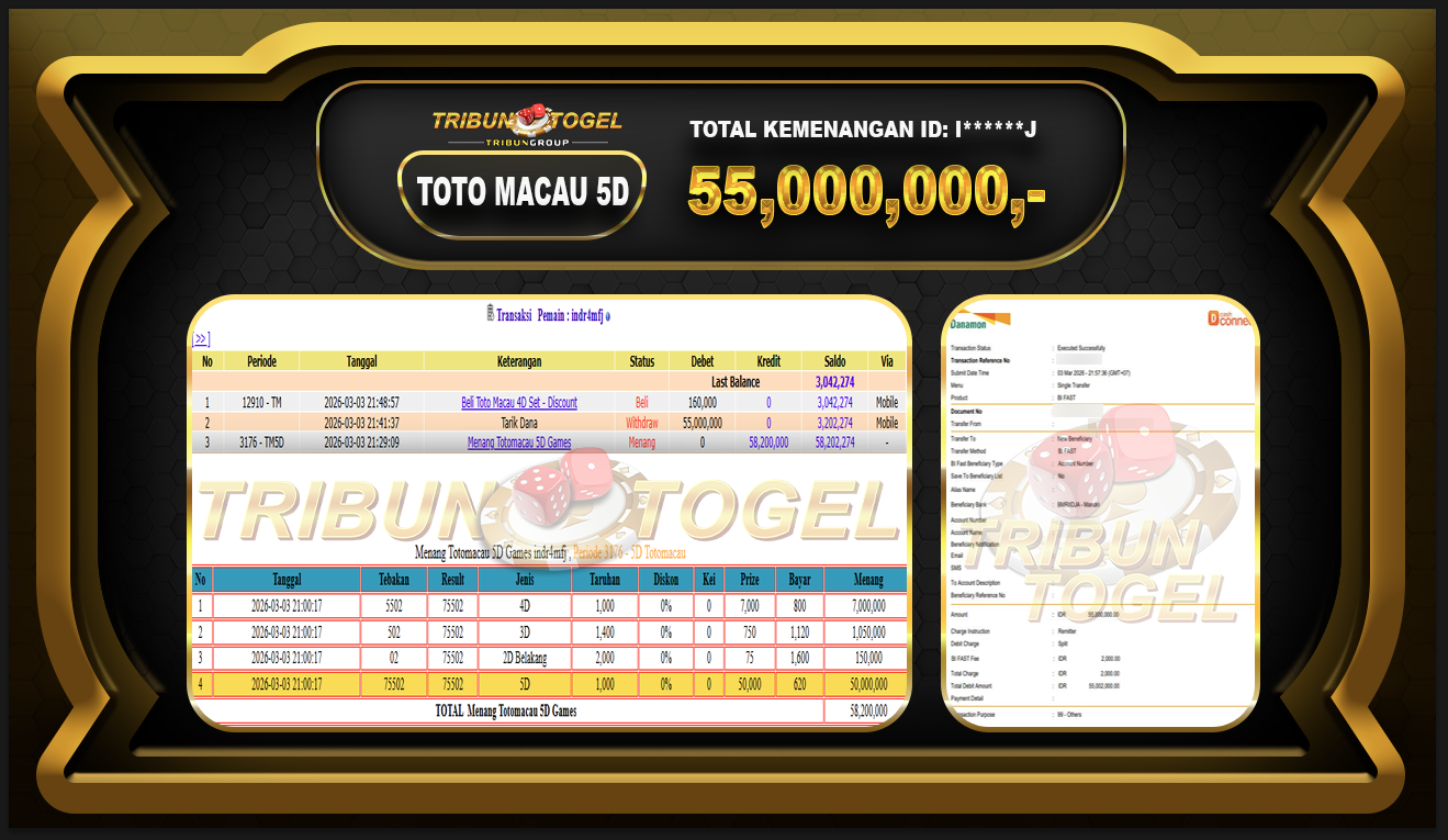 Kami ucapkan selamat kepada user ID : l******J telah berhasil withdraw sebesar Rp.55,000,000,- di game : TOTOMACAU 5D Bukti pembayaran jackpot member Tribuntogel kami bayar lunas dengan waktu paling singkat