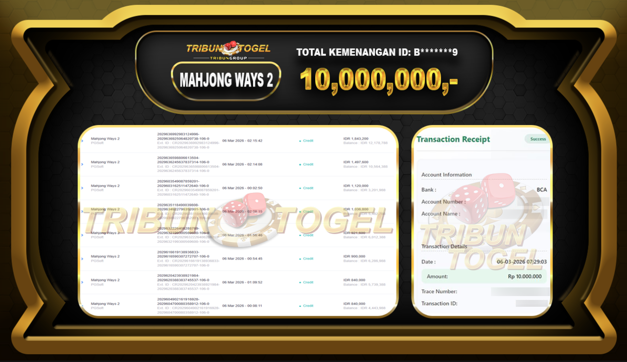 Kami ucapkan selamat kepada user ID : B********9 telah berhasil withdraw sebesar Rp. 10,000,000,- di game : SLOT MAHJONG WAYS  Bukti pembayaran jackpot member Tribuntogel kami bayar lunas dengan waktu paling singkat.