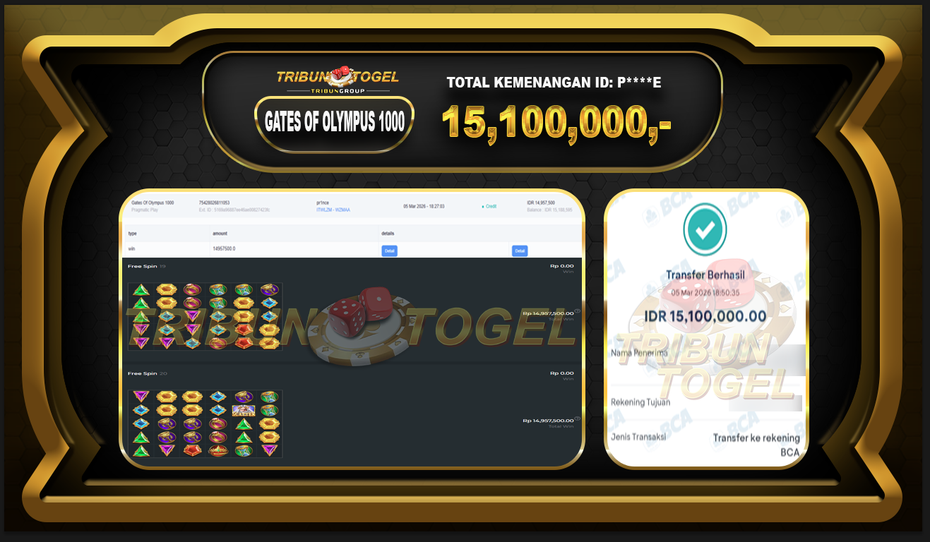 Kami ucapkan selamat kepada user ID : P****E telah berhasil withdraw sebesar Rp. 15,100,000,- di game : GATES OF OLYMPUS SUPER SCATTER Bukti pembayaran jackpot member Tribuntogel kami bayar lunas dengan waktu paling singkat.
