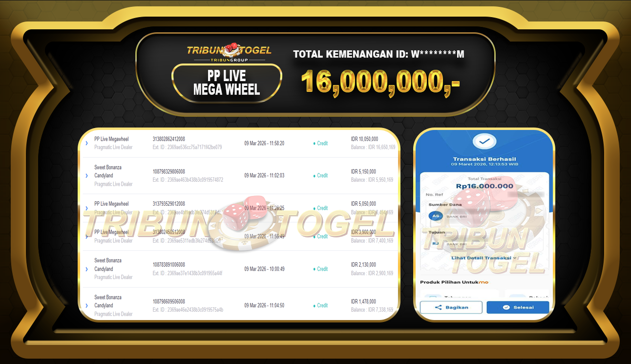 Kami ucapkan selamat kepada user ID : W********M telah berhasil withdraw sebesar Rp. 16,000,000,- di game : PP LIVE MEGAWHEEL