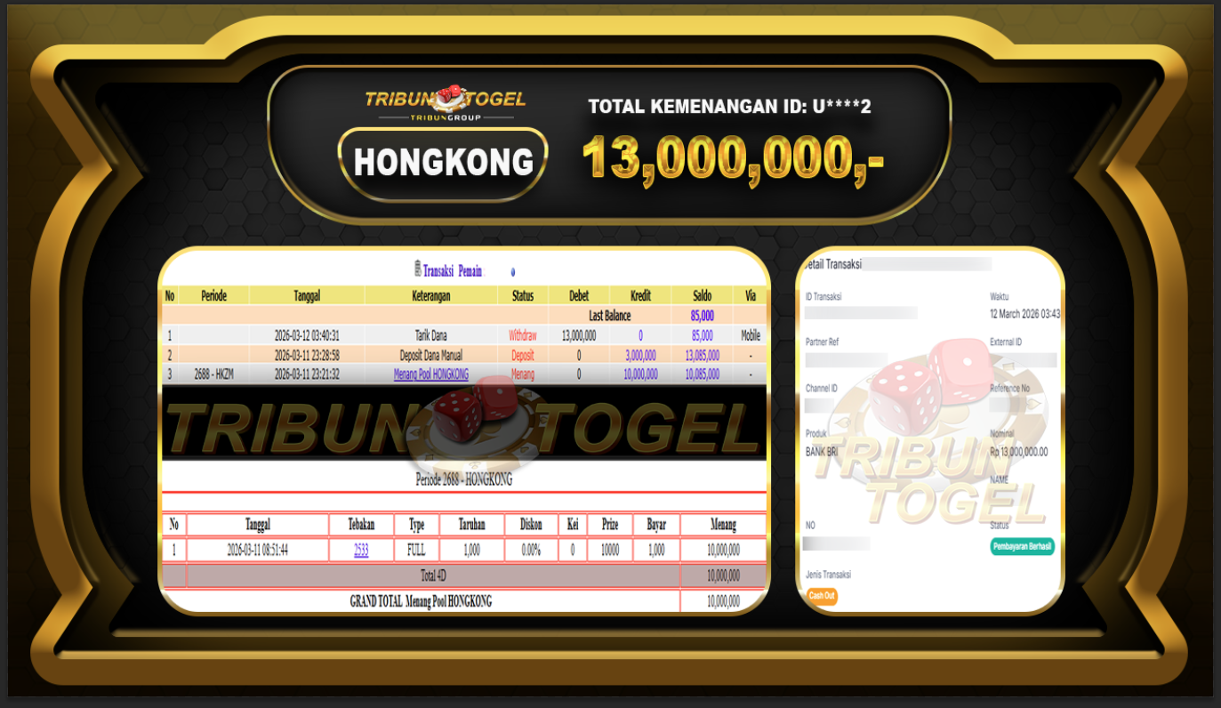 Kami ucapkan selamat kepada user ID : U****2 telah berhasil withdraw sebesar Rp. 13,000,000,- di game : HONGKONG LOTTO Bukti pembayaran jackpot member Tribuntogel kami bayar lunas dengan waktu paling singkat.