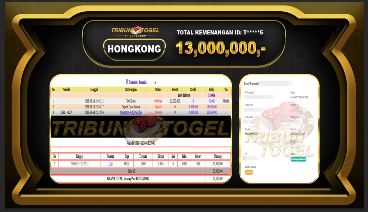 Kami ucapkan selamat kepada user ID : T******5 telah berhasil withdraw sebesar Rp. 13,000,000,- di game : HONGKONG LOTTO Bukti pembayaran jackpot member Tribuntogel kami bayar lunas dengan waktu paling singkat.