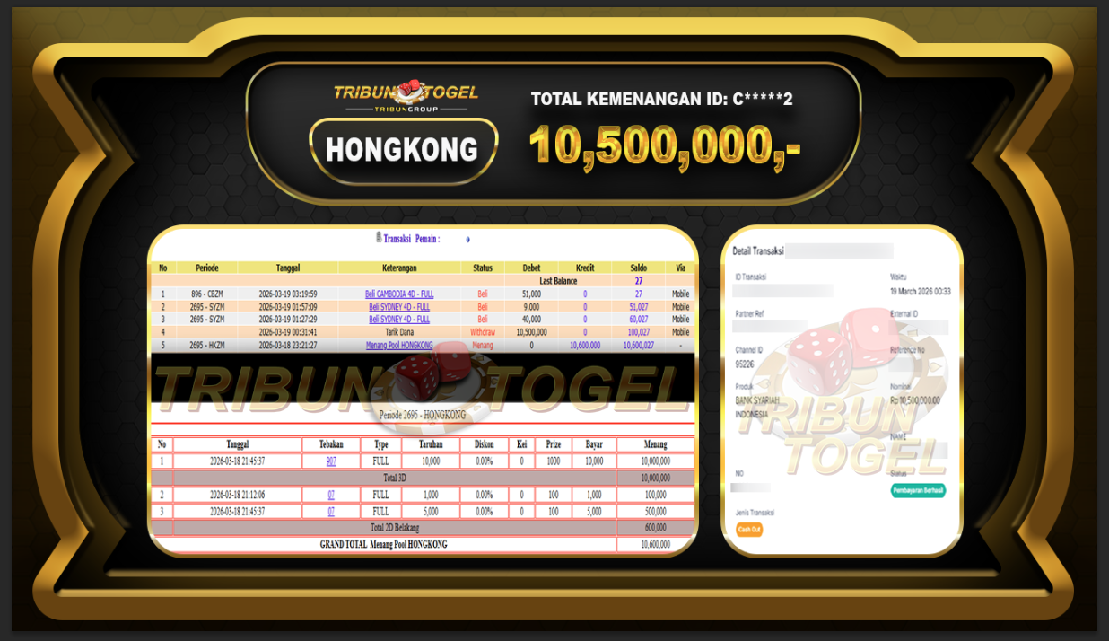 Kami ucapkan selamat kepada user ID : C*******2 telah berhasil withdraw sebesar Rp. 10,500,000,- di game : HONGKONG LOTTO Bukti pembayaran jackpot member Tribuntogel kami bayar lunas dengan waktu paling singkat.