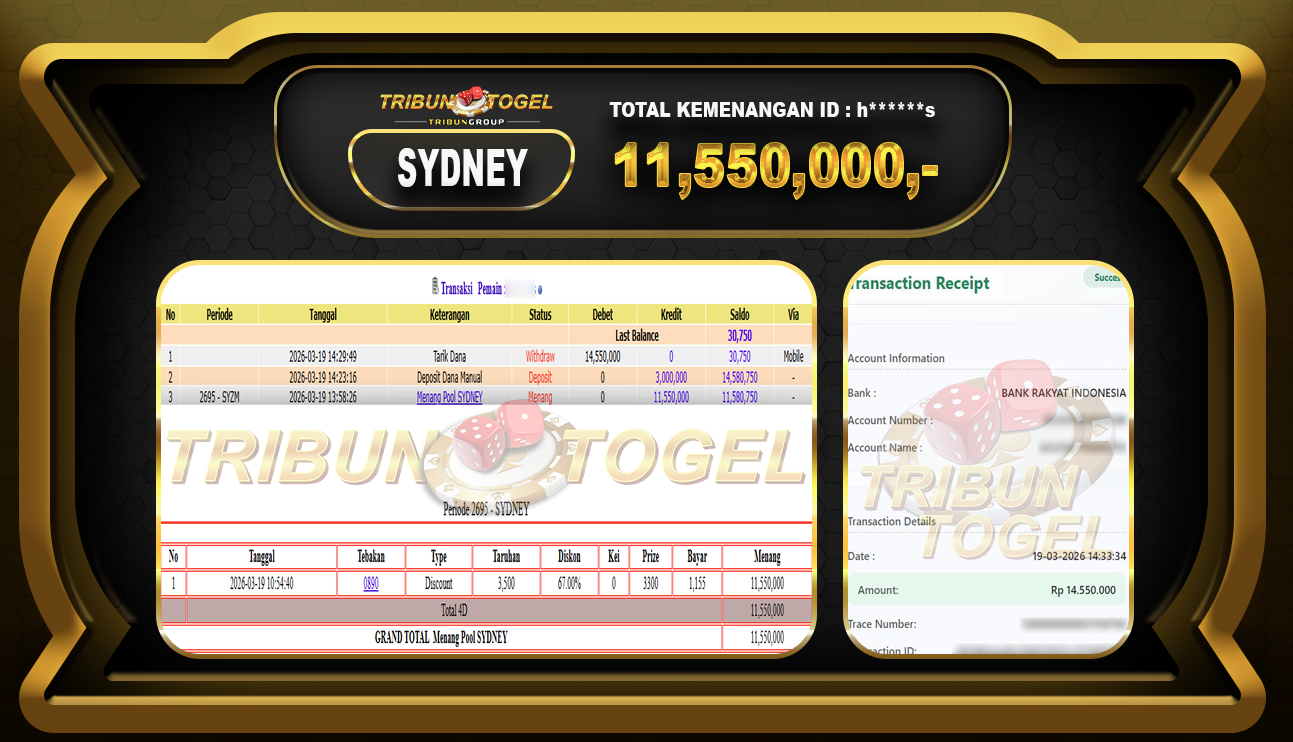 Kami ucapkan selamat kepada user ID : H*****s telah berhasil withdraw sebesar Rp.11,550,000,- di game : SYDNEYLOTTO Bukti pembayaran jackpot member Tribuntogel kami bayar lunas dengan waktu paling singkat.