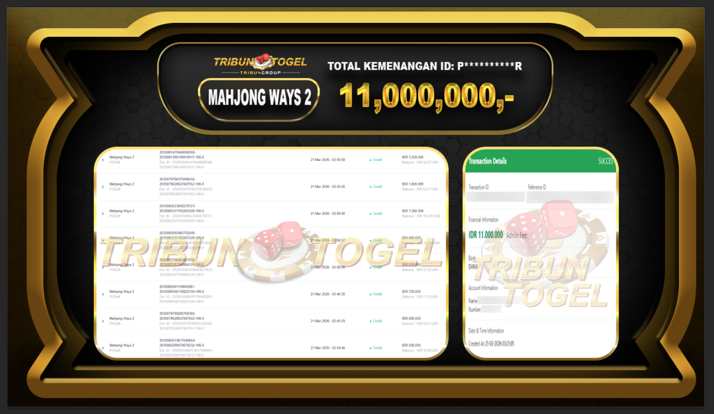 Kami ucapkan selamat kepada user ID : P**********R telah berhasil withdraw sebesar Rp.11,000,000,- di game : SLOT MAHJONG WAYS 2  Bukti pembayaran jackpot member Tribuntogel kami bayar lunas dengan waktu paling singkat.