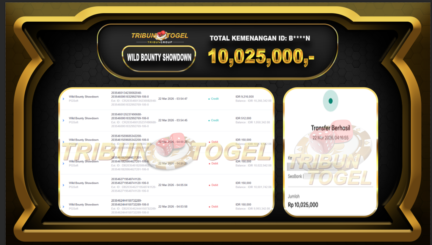 Kami ucapkan selamat kepada user ID : B****N telah berhasil withdraw sebesar Rp. 10,025,000, di game : SLOT WILD BOUNTY SHOWDOWN Bukti pembayaran jackpot member Tribuntogel kami bayar lunas dengan waktu paling singkat.