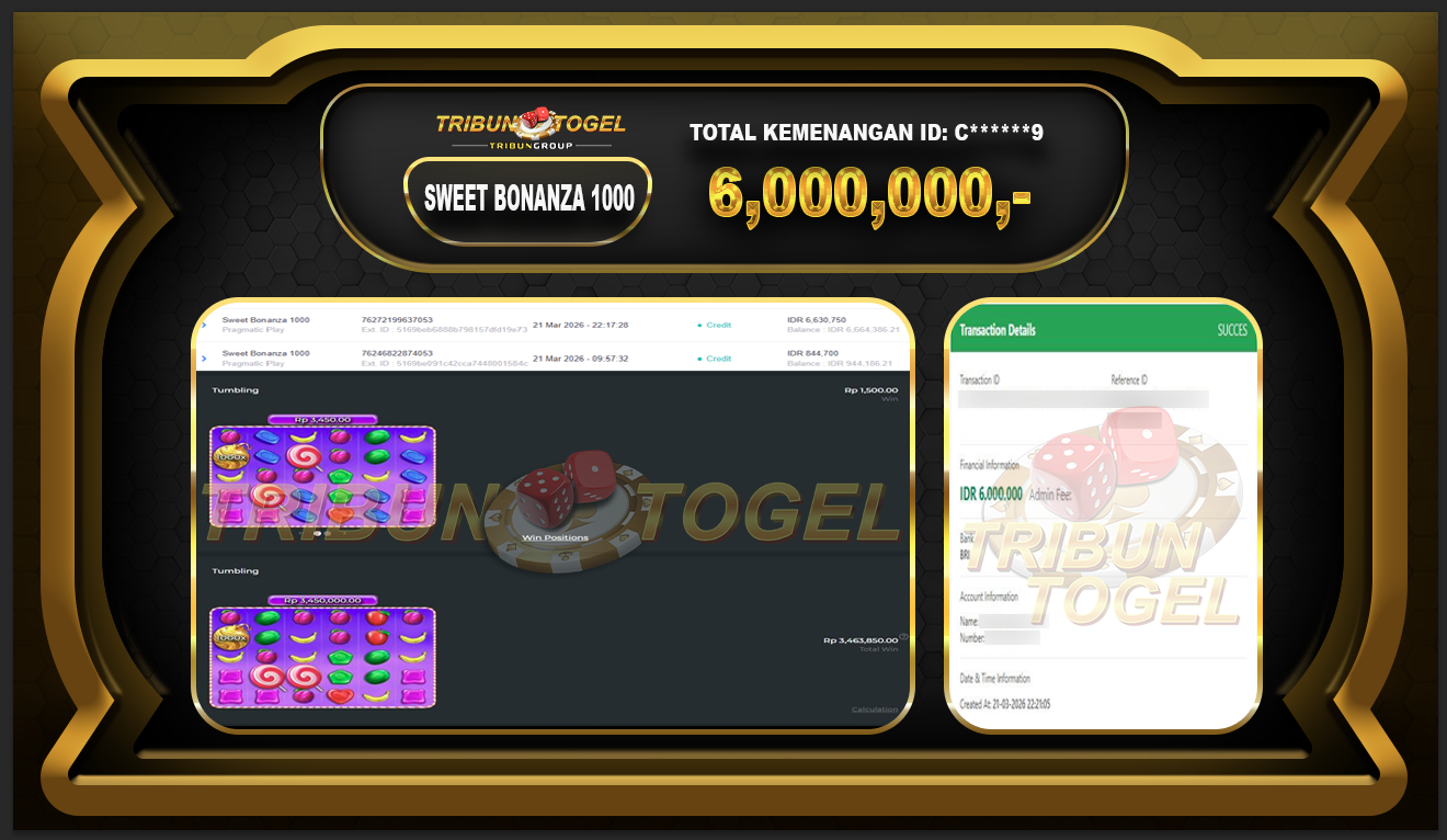 Kami ucapkan selamat kepada user ID : C*******9 telah berhasil withdraw sebesar Rp.6,000,000, game : SLOT SWEET BONANZA 1000 Bukti pembayaran jackpot member Tribuntogel kami bayar lunas dengan waktu paling singkat.