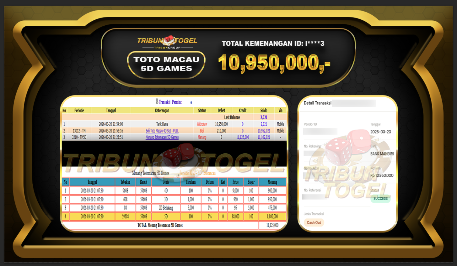 Kami ucapkan selamat kepada user ID : I****3 telah berhasil withdraw sebesar Rp.10,950,000,- di game : TOTO MACAU 5D GAMES Bukti pembayaran jackpot member Tribuntogel kami bayar lunas dengan waktu paling singkat
