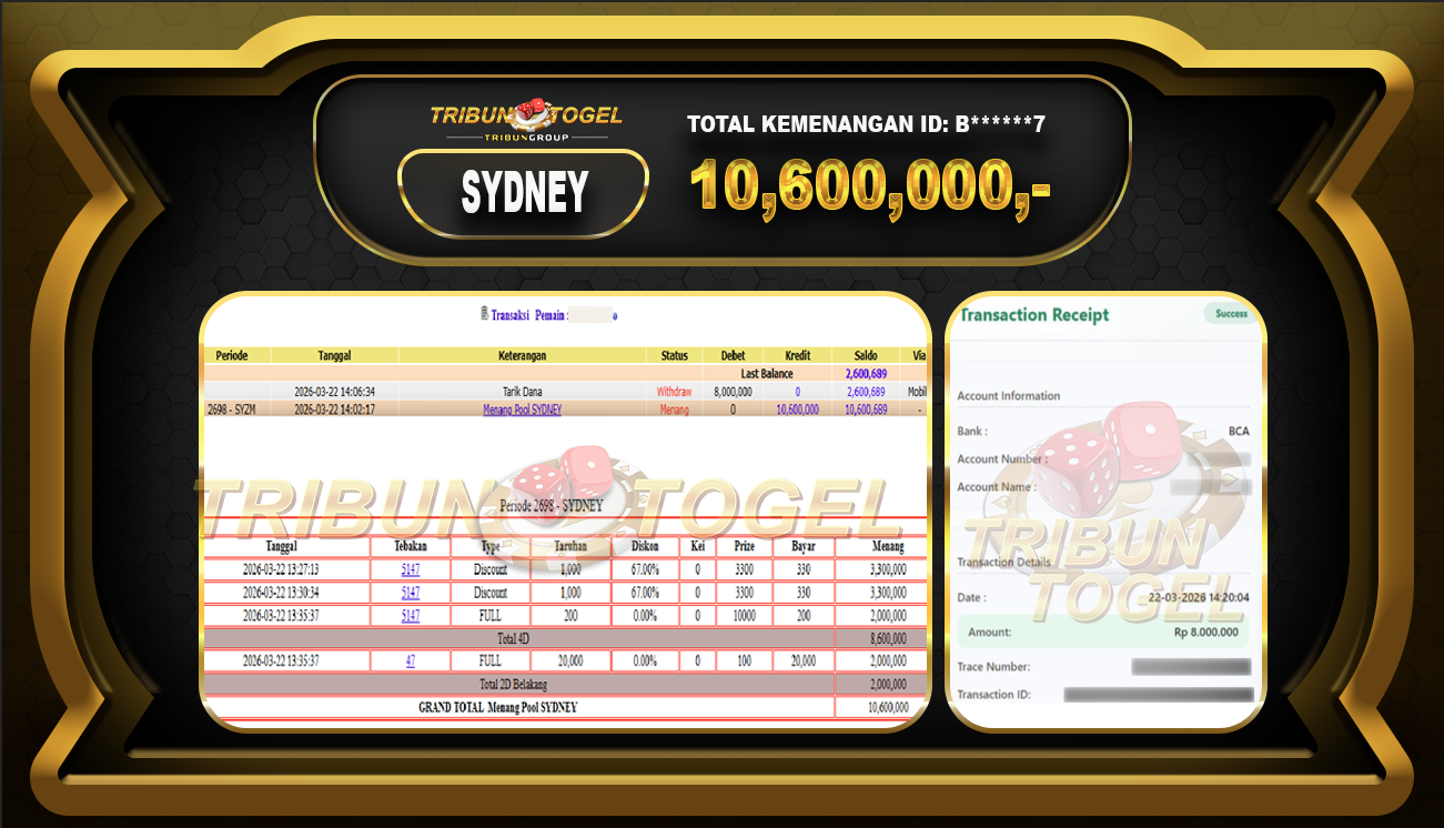 Kami ucapkan selamat kepada user ID : B*******7 telah berhasil withdraw sebesar Rp.10,000,000,- di game : SYDNEYLOTTO Bukti pembayaran jackpot member Tribuntogel kami bayar lunas dengan waktu paling singkat.