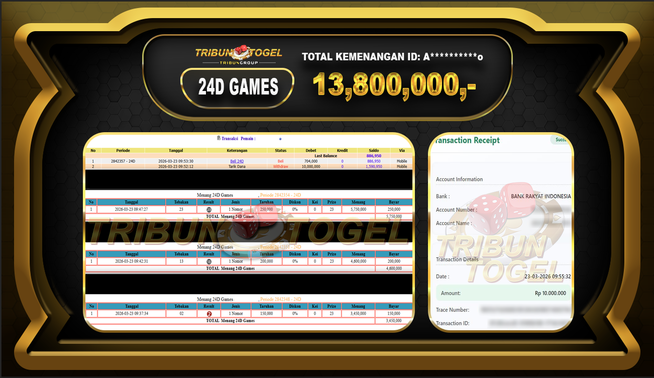 Kami ucapkan selamat kepada user ID A*********o telah berhasil withdraw sebesar Rp.13,800,000 di game : 24D GAMES Bukti pembayaran jackpot member Tribuntogel kami bayar lunas dengan waktu paling singkat.