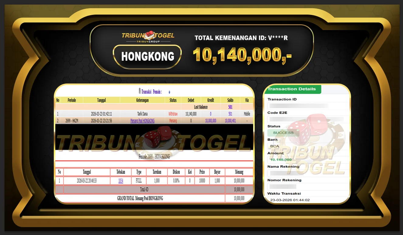 Kami ucapkan selamat kepada user ID : V****R telah berhasil withdraw sebesar Rp. 10,140,000,- di game : HONGKONG LOTTO Bukti pembayaran jackpot member Tribuntogel kami bayar lunas dengan waktu paling singkat.