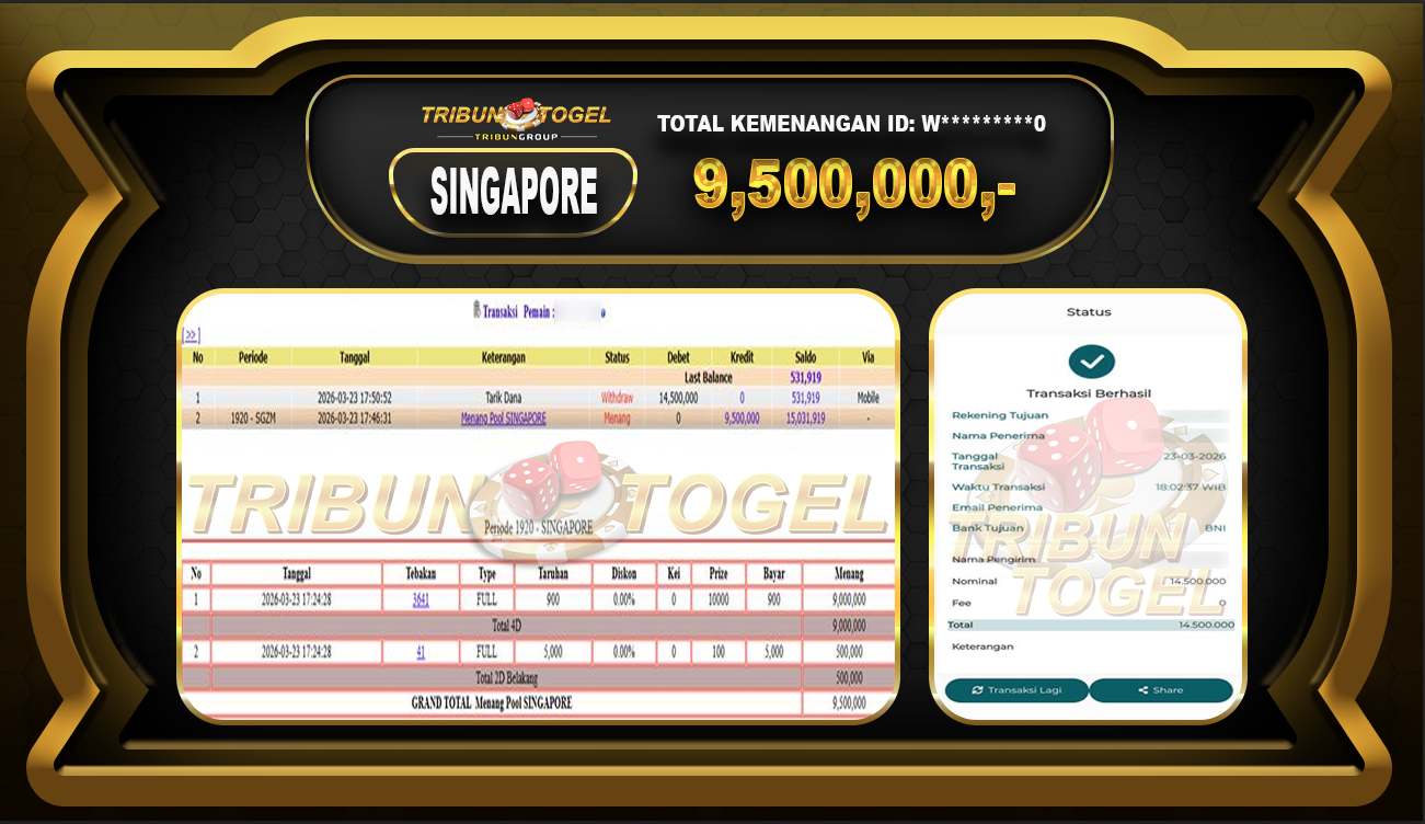 Kami ucapkan selamat kepada user ID : W*******0 telah berhasil withdraw sebesar Rp. 9,500,000,- di game : SINGAPORE Bukti pembayaran jackpot member Tribuntogel kami bayar lunas dengan waktu paling singkat.
