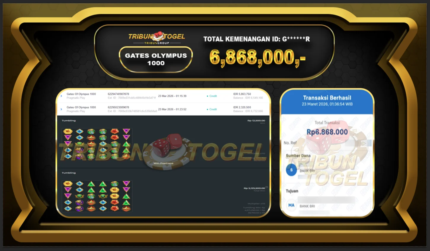 Kami ucapkan selamat kepada user ID : G******R telah berhasil withdraw sebesar Rp.6,868,000,- di game : GATES OF OLYMPUS SUPER SCATTER Bukti pembayaran jackpot member Tribuntogel kami bayar lunas dengan waktu paling singkat.