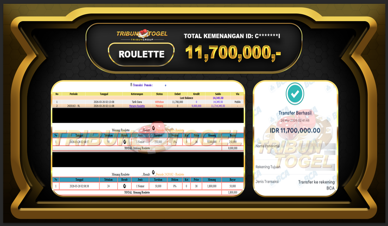 BUKTI PEMBAYARAN ROULETTE TRIBUNTOGEL RP. 11,700,000,-
