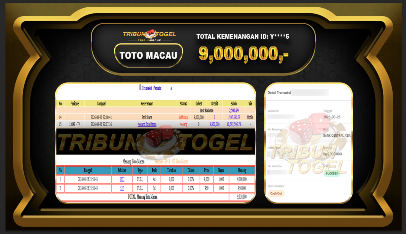 Kami ucapkan selamat kepada user ID : Y****5 telah berhasil withdraw sebesar Rp.9,000,000,- di game : TOTO MACAU Bukti pembayaran jackpot member Tribuntogel kami bayar lunas dengan waktu paling singkat