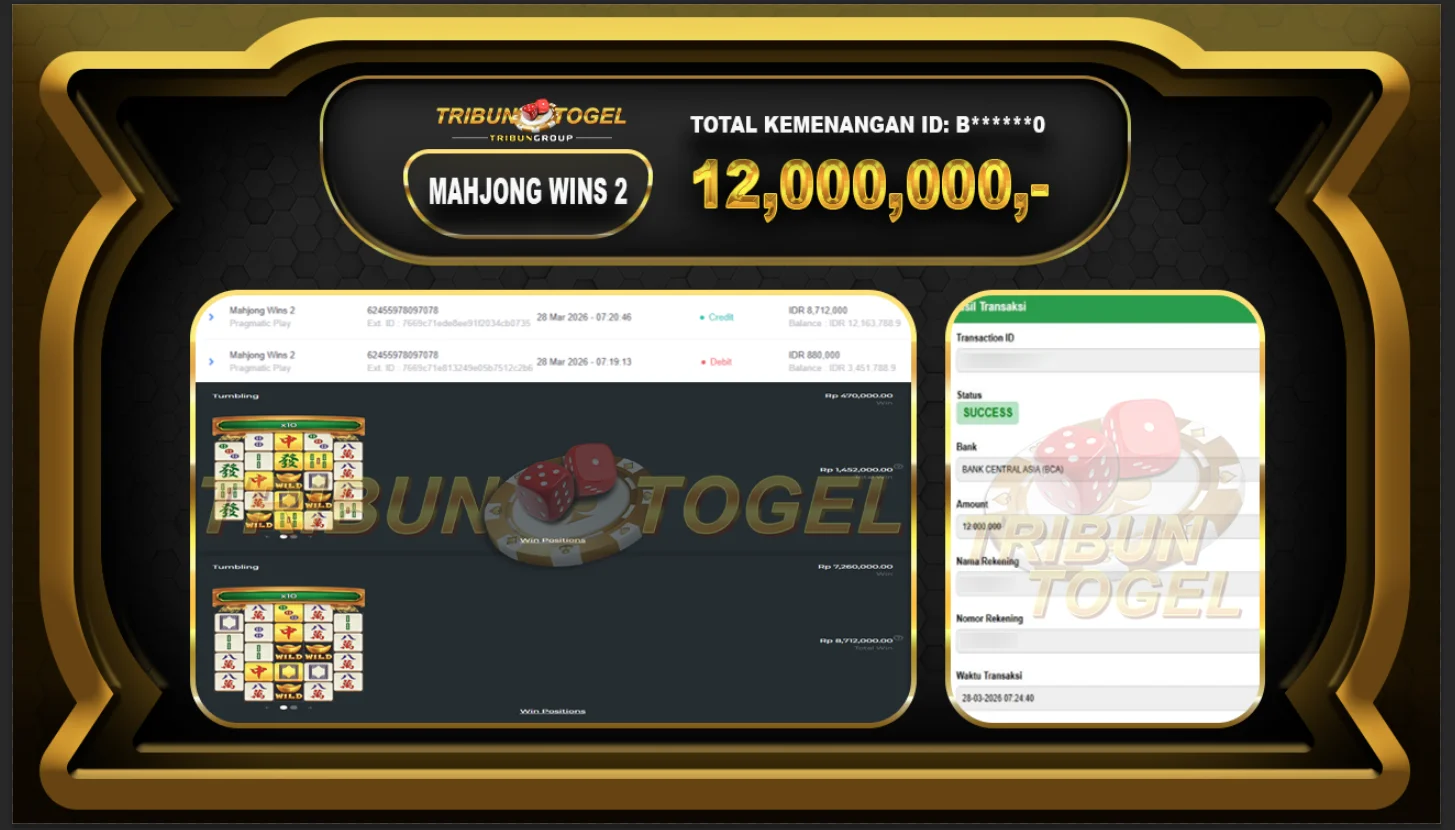Kami ucapkan selamat kepada user ID : B******0 telah berhasil withdraw sebesar Rp.12,000,000,- di game : SLOT MAHJONG WAYS 2 Bukti pembayaran jackpot member Tribuntogel kami bayar lunas dengan waktu paling singkat.