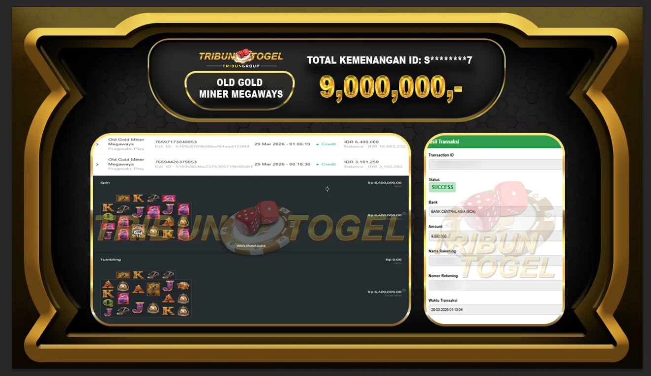 Kami ucapkan selamat kepada user ID : S********7 telah berhasil withdraw sebesar Rp. 9,000,000,- di game : OLD GOLD MINER MEGAWAYS Bukti pembayaran jackpot member Tribuntogel kami bayar lunas dengan waktu paling singkat.