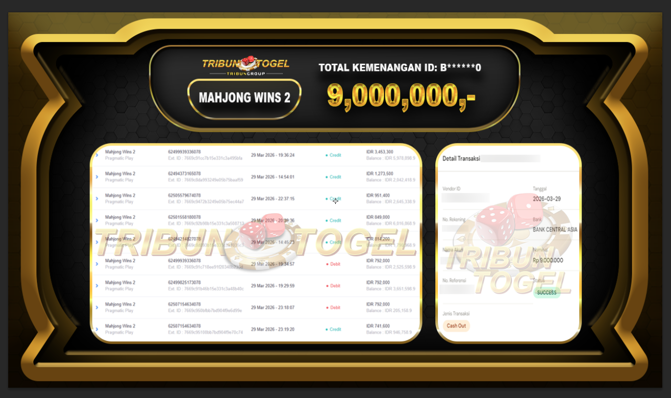 Kami ucapkan selamat kepada user ID :B******0 telah berhasil withdraw sebesar Rp.9,000,000,- di game : SLOT MAHJONG WAYS 2  Bukti pembayaran jackpot member Tribuntogel kami bayar lunas dengan waktu paling singkat.