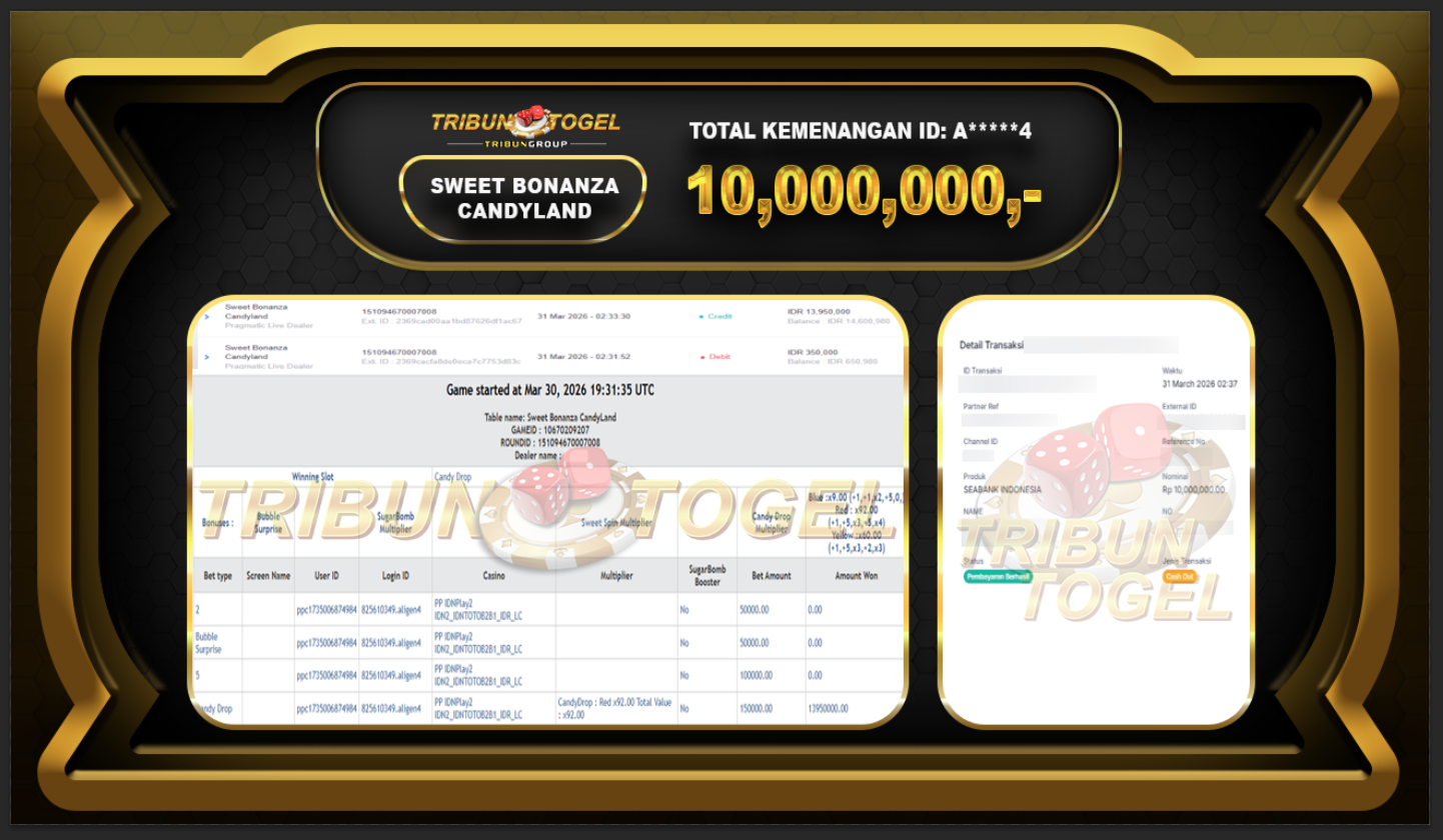 Kami ucapkan selamat kepada user ID : A*****4 telah berhasil withdraw sebesar Rp.10,000,000: SLOT SWEET BONANZA CANDYLAND Bukti pembayaran jackpot member Tribuntogel kami bayar lunas dengan waktu paling singkat.